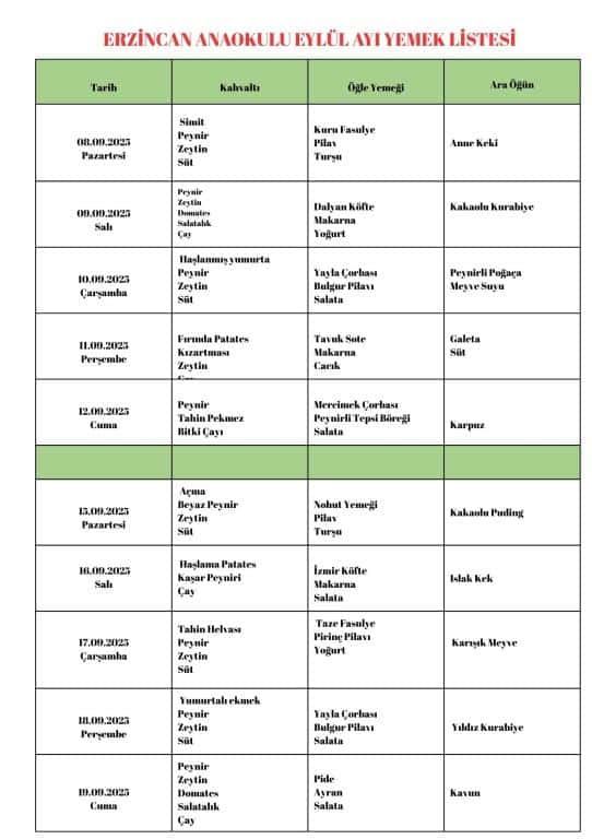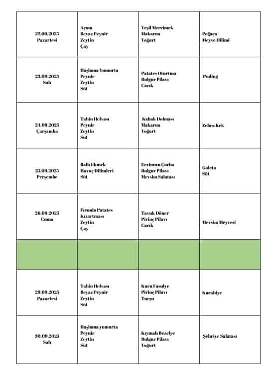 EYLÜL Ayı Yemek Listesi